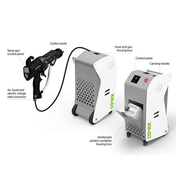 - The disinfectant solution is ionized with a high-voltage electrode and negatively charged. The disinfectant pump injection generates the microparticles through the nozzle and the air projected by the compressor.
